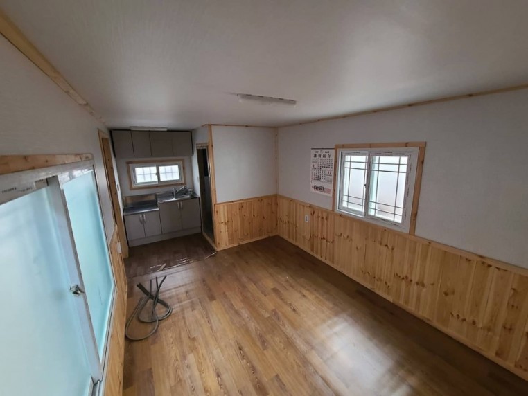 3*6이동식주택, 써모싸이딩, 바닥철판, 지붕판넬, 외부등, 고급출입문, 격자무늬 큰창, 작은창, 반루바, 싱크대, 상부장, 화장실, 세면대