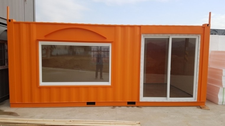 3*6컨테이너, 슬라이딩도어, 폐화유리1장, 바닥철판, 페인트변경(오렌지), 방범창